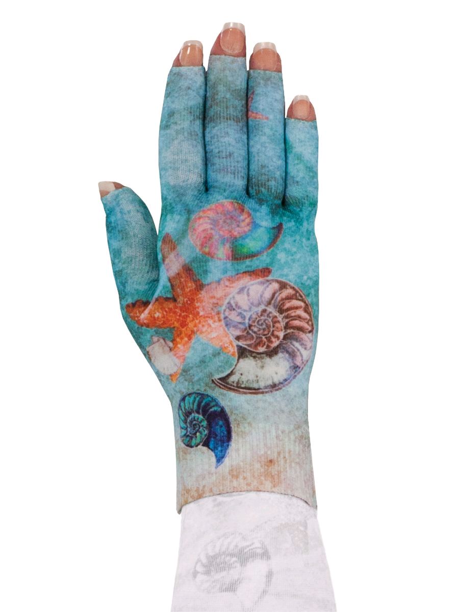 Compression Glove with cool, blue sea and sea shells pattern, will help lessen and prevent swelling in the hand caused by Lymphoedema.