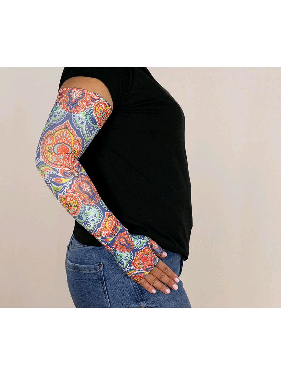 Lymphoedema Sleeve and matching gauntlet with a colourful, paisley design.