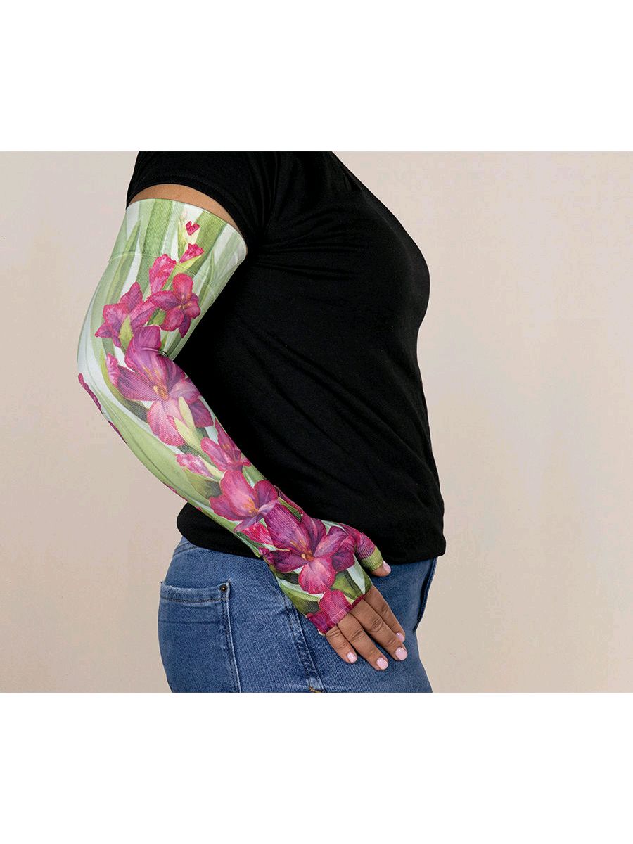 Colourful, feminine, floral design, the Ayana Lymphoedema Sleeve and matching Gauntlet is sure to get many positive comments.